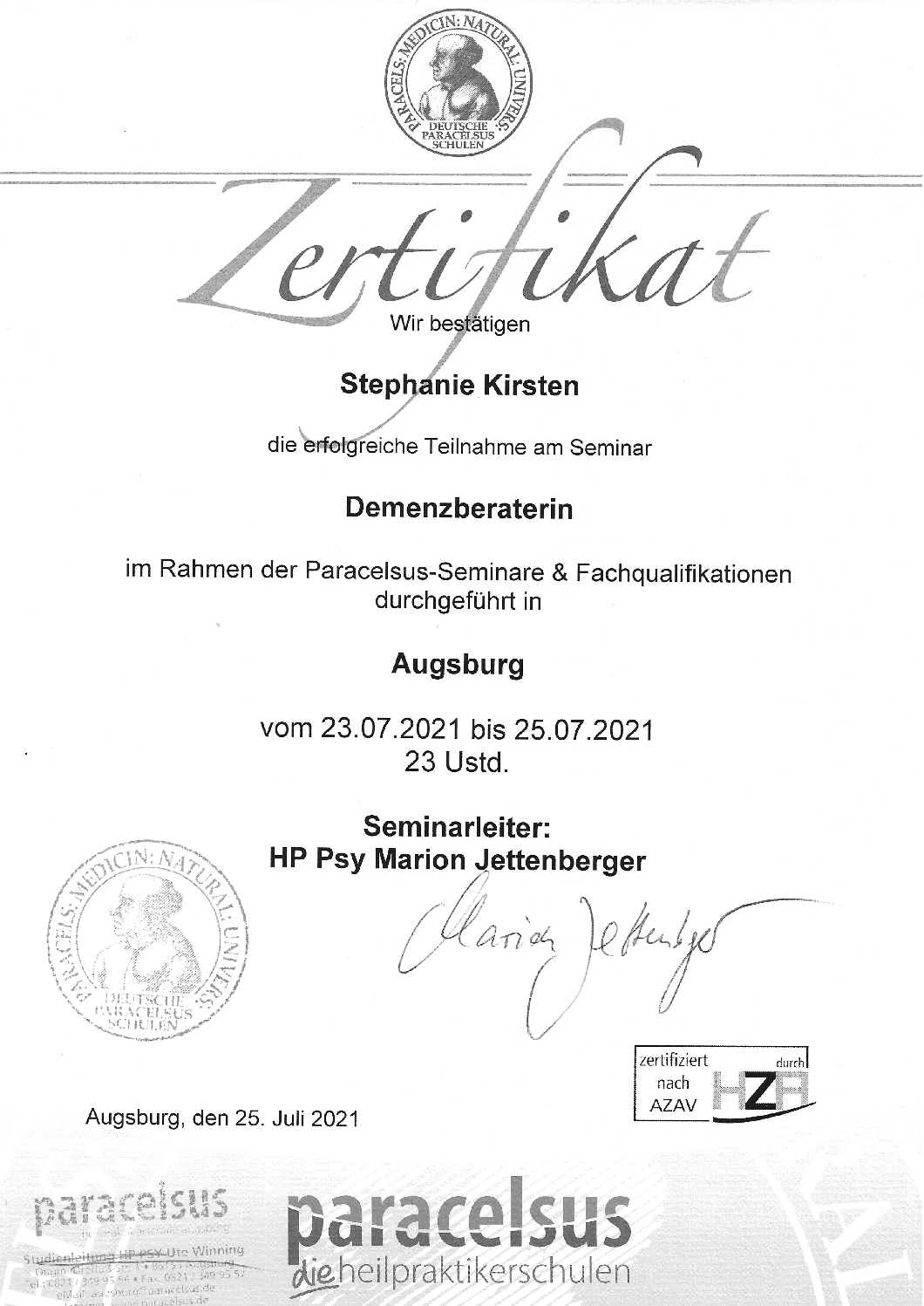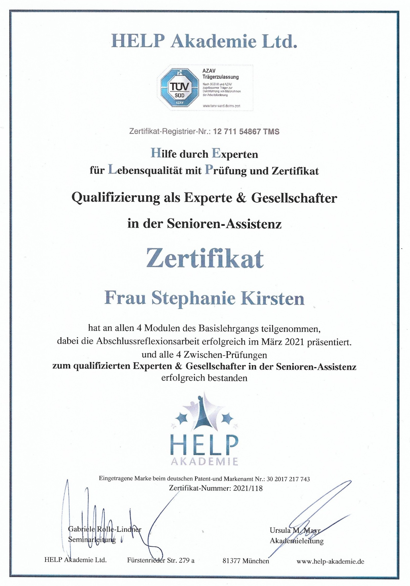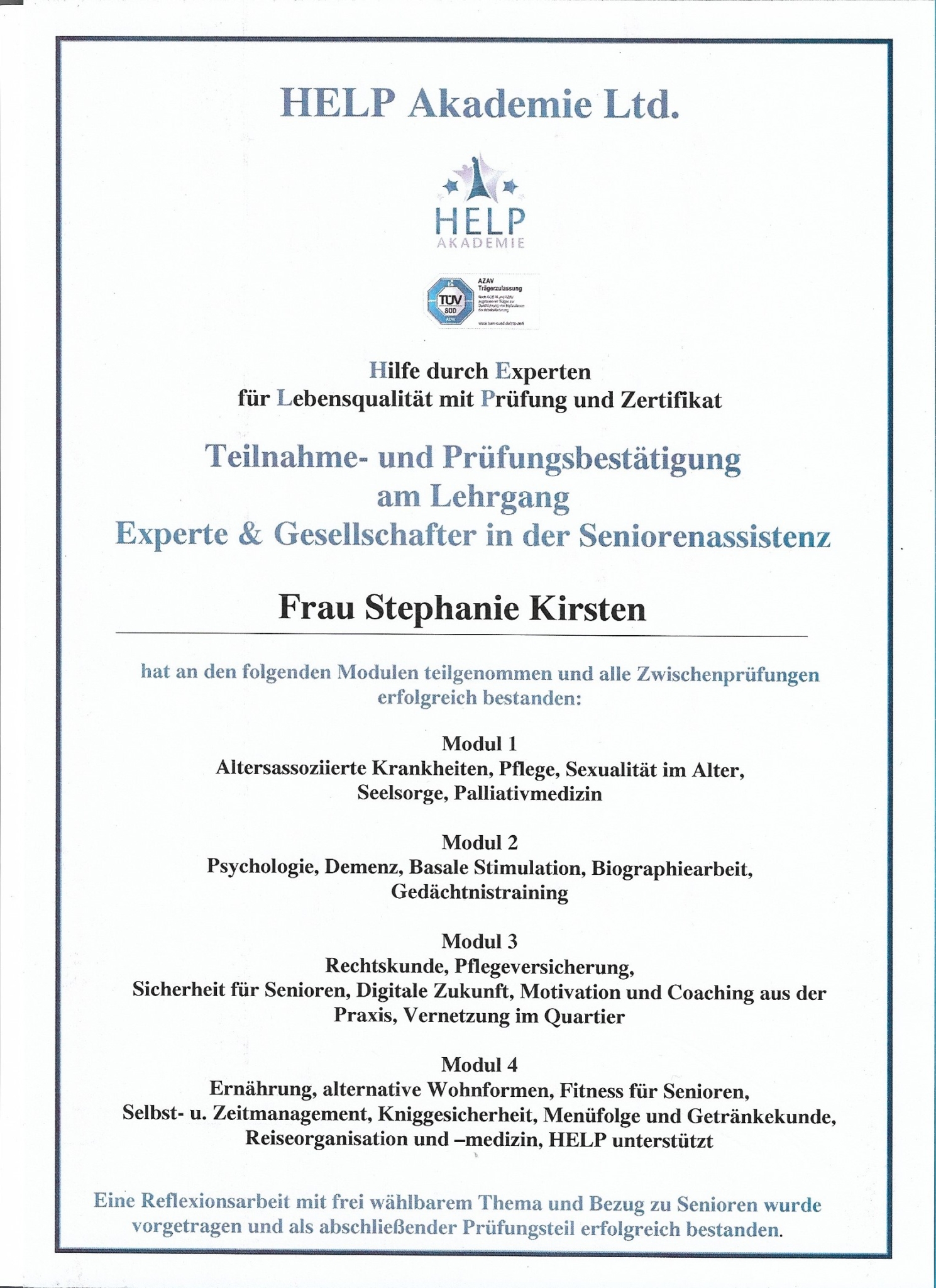 Zertifizierung als Expertin und Gesellschafterin in der Seniorenassistenz